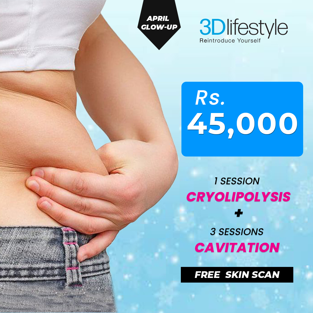 3D Lifestyle is offering 1 Cryolipolysis session + 3 Cavitation sessions for Rs. 45,000. A free skin scan is included. These treatments help reduce fat in specific areas and shape your body without surgery.